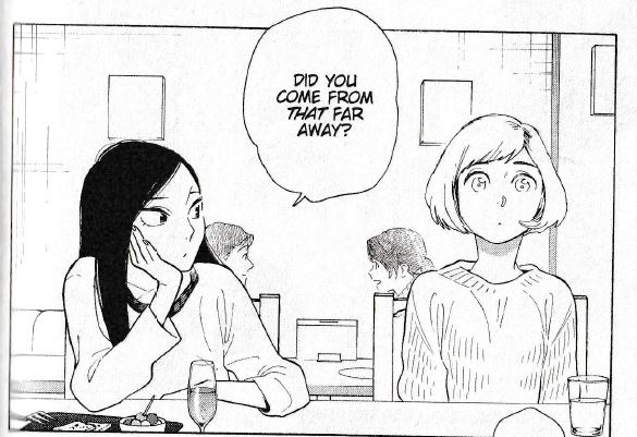 For the most part, backgrounds are simple and clean. Occasionally, we have a large picnic, bar, restaurant, or interior room ~ but generally they’re blank, beta, or screentone. I tend to like this ~ I think it draws the reader’s attention to the focus of the panel without much distraction, but I do love some of the detailed backgrounds that are scattered throughout.