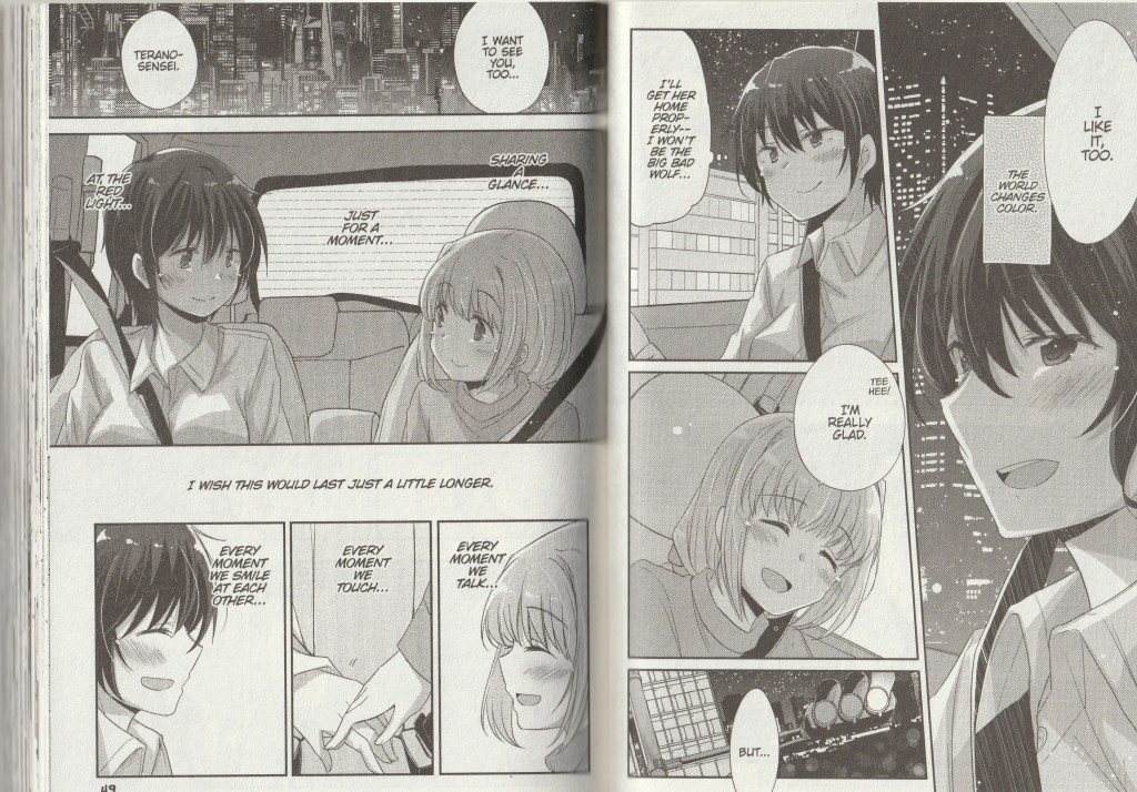 I found Terano to be an interesting character even though we don’t see as much of the story from her POV until the last two chapters of this volume. She’s innocent and a bit naive, but passionate and actively pursuing her relationship with Hayama. She’s popular among students and teachers, but she likes being alone (or with Hayama) in her lab prep room. She’s nervous and embarrassed, but still initiates her fair share of their intimate encounters. I’m looking forward to seeing more from her perspective as we move forward.