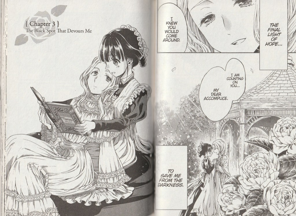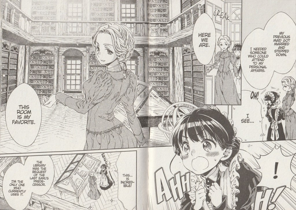The Art: The gowns, clothing, and setting are all drawn beautifully. I often found myself staring at the outfits and imagining them as a cosplay before being smacked back to reality with the complexity of this era’s clothing (~1900 England). The settings have such painstaking detail ~ such as the drawings of Lady Alice’s library or rose garden ~ that they evoke the sense of being very real places that you can travel to England to visit and see with your own eyes.