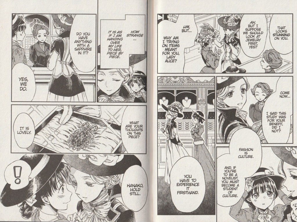 I chose this spread for a couple reasons. First up ~ Lady Alice’s nature towards her staff is really highlighted in her kindness. She invited Hanako to London to look at fashions ostensibly to help her learn to select appropriate accessories for Lady Alice and to provide Hanako a skill for when she’s gone, but ends up having Hanako try on the various pieces under the guise of educating her in a topic essential for her journey as a novelist. Second, the details in the setting, their hats, dresses, and accessories are stunning. Third: Violet Evergarden parallel anyone?