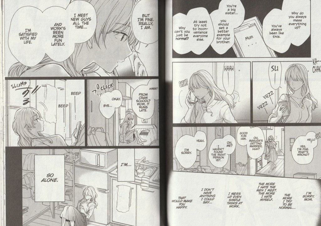 Story Impressions: At first glance, this can be depressing ~ and there’s certainly a bit of a ‘feels trip’ element to Uno’s self loathing ~ and messy, but Shio Usui handles this pretty well and effectively humanizes our MCs right off the bat. There’s a number of elements for readers in their mid- / late- twenties to thirties will see of themselves in these pages: societal / familial pressures to conform to the ‘normal’ and expected path in life, the stress of maintaining appearances, imposter syndrome, and the questioning that comes as a result of these things.