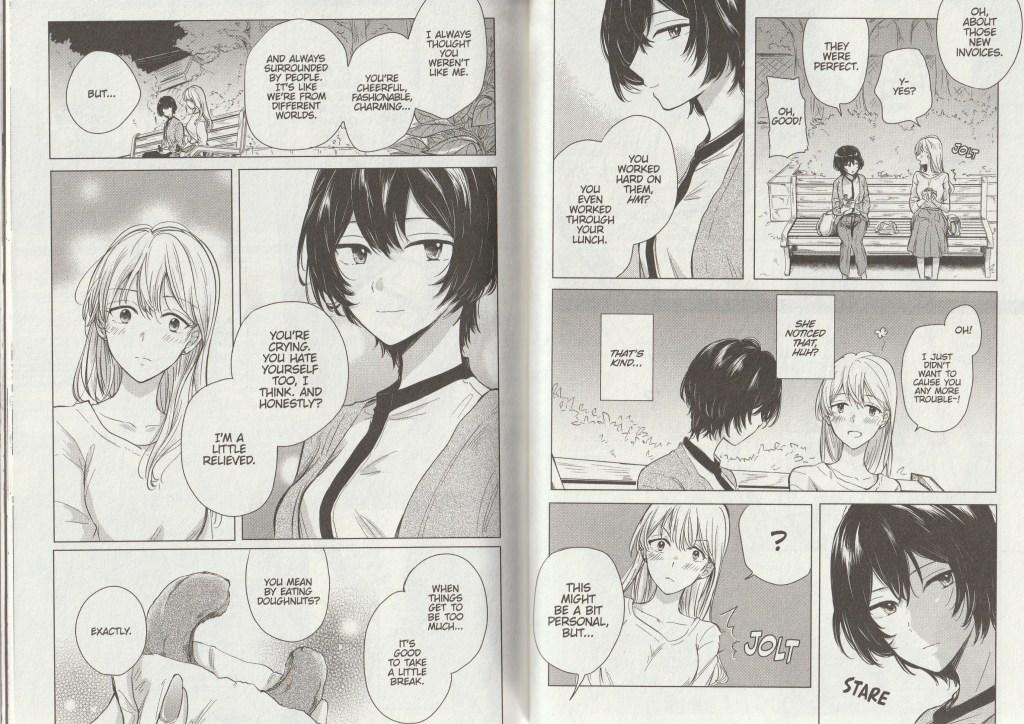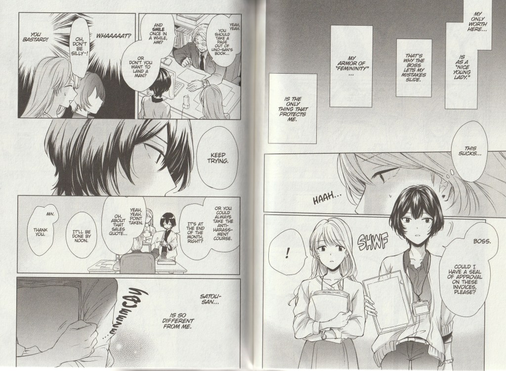 There’s a couple of subtle themes in here that I appreciate the author throwing into the mix ~ the casual sexism at work, the overbearing parents, the responsibility Satou has for her sister, and the way both Satou and Hinako act through their masks to the world. Specifically, Hinako references her ‘armor of femininity’ and is pretty blatant in her inner monologues that she’s putting on a face for the world, Satou on the other hand, is who she is ~ the face she presents is her, and people don’t like her because she doesn’t force herself to mold her behavior into expectations.