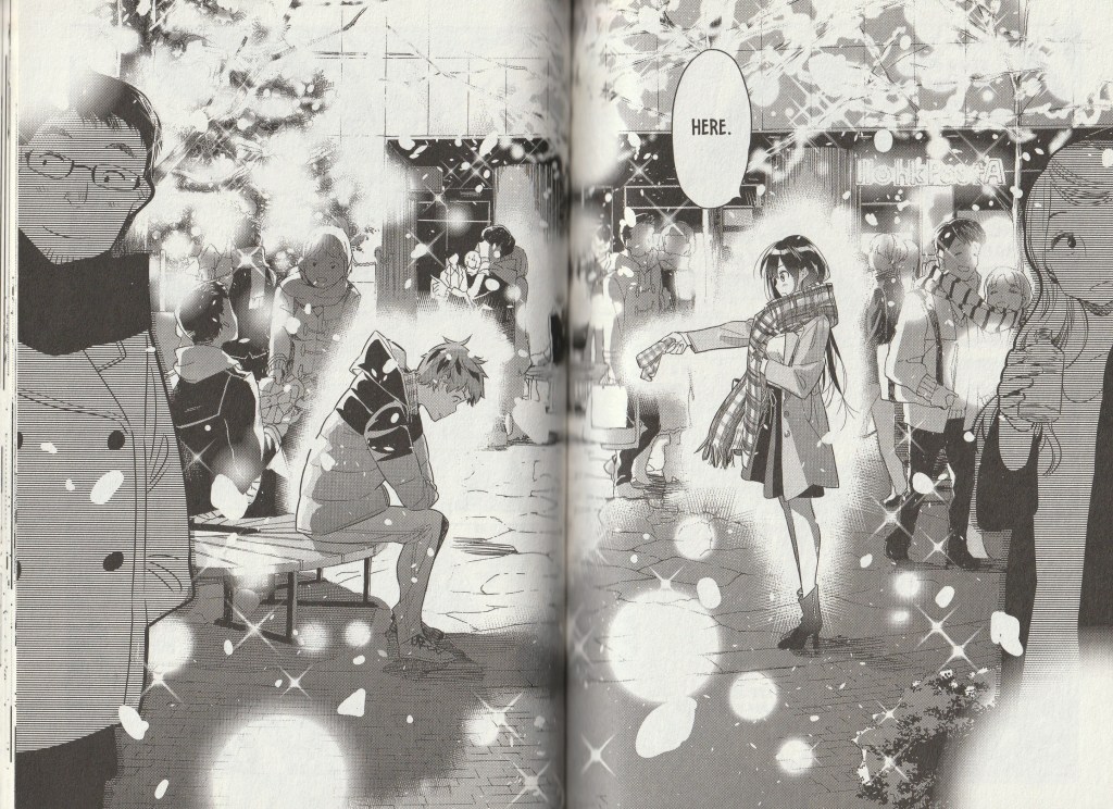 Back to that hot, hot Kazuya x Chizuru (non) interaction ~ in the form of 3x chapter of him awkwardly stalking her on Christmas after spotting her with another guy while he was out. (Non) Spoiler ~ Mystery Hot Dude is just one of Chizuru’s classmates that she asked for some pointers on her quest to becoming an actress. Stand up guy, Mystery Hot Dude, even puts in a good word for her with his producer as well! Kazuya, of course misinterprets everything and, as his unique skill set allows, makes it all super awkward for all parties involved. Meanwhile, Mystery Hot Dude helped Chizuru select a nice little holiday present for Kazuya (not because she likes him or anything).